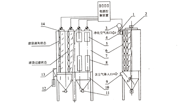 反吹空氣通過電動三通閥進入箱體后,與過濾狀態(tài)相比反向通過濾袋,與此同時,高頻電振器開始動作,使濾袋隨這作高頻震動。在反吹及高頻振動的同時作用下起到清灰的效果(清灰時間是可調(diào)的)。清灰結(jié)束時高頻電振停止振動。電動三通閥主閥板打開,付閥同時關(guān)閉,又恢復(fù)了正常過濾狀態(tài)??梢园凑招枰{(diào)整清灰的相鄰間隔時間、使各箱體按指定的時間依次序進行清灰。