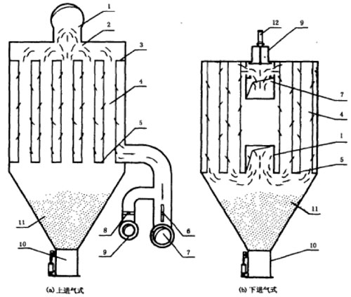 當除塵器運行阻力到一定值后,需對濾袋清灰。清灰工作狀態(tài),如圖8-3a所示。其工作過程如下:當提升切換閥向下運動,閥板在將出風口關(guān)閉的同時打開反吹風口和截止閥,由于反吹風機鼓入的氣流是與過濾氣流方向相反的逆氣流,改變了濾袋內(nèi)外的壓差,使濾袋由“膨脹”變“縮癟”狀態(tài),剝離濾袋內(nèi)表面附著的粉塵層。提升切換閥向上運動,閥板在將出風口打開的同時關(guān)閉反吹風口和截止閥,除塵濾袋重新“膨脹”,除塵器恢復(fù)到正常過濾狀態(tài)。