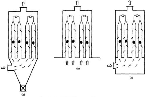 濾袋一般采用729滌綸除塵布袋或滌綸針刺氈,縫制成三袋聯(lián)體袋(也稱三聯(lián)袋),底部縫有彈性環(huán)使其能直接卡入花板孔中,頂部縫有相同材料的掛帶使其能將濾袋張緊和吊掛在搖桿上(見圖7-3)。過(guò)濾形式為內(nèi)濾式。工作時(shí)含塵氣體由濾袋下口進(jìn)入內(nèi)部;過(guò)濾后的清潔氣體經(jīng)袋室由排風(fēng)機(jī)排入大氣,清灰時(shí)先停止過(guò)濾工作,再啟動(dòng)搖動(dòng)清灰機(jī)構(gòu)進(jìn)行清灰。