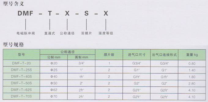 DMF-T型電磁脈沖閥為直通閥,其進(jìn)氣口之間夾角為180°(進(jìn)出口中心線為同一直線),其進(jìn)口與儲(chǔ)氣筒連接,出口與噴吹管連接。氣流暢通,能提供符合要求的清灰氣脈沖。
