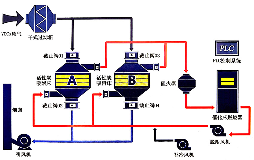 活性炭吸附脫附•催化燃燒裝置是根據(jù)吸附(效率高)和催化燃燒(節(jié)能)兩個基本原理設(shè)計,采用雙氣路連續(xù)工作,一個催化燃燒室,兩個或多個吸附床交替使用。先將有機廢氣用活性炭吸附,當快達到飽和時停止吸附,然后用熱氣流將有機物從活性炭上脫附下來使活性炭再生;脫附下來的有機物已被濃縮(濃度較原來提高十倍以上)并送往催化燃燒室催化燃燒成二氧化碳及水蒸氣排出。當有機廢氣的濃度達到2000PPm以上時,有機廢氣在催化床可維持自燃,不用外加熱。燃燒后的尾氣一部分排入大氣,大部分被送往吸附床,用于活性炭再生。這樣可滿足燃燒和吸附所需的熱能,達到節(jié)能的目的。再生后的活性炭可進入下次吸附;在脫附時,凈化操作可用另一個吸附床進行,既適合于連續(xù)操作,也適合于間斷操作。