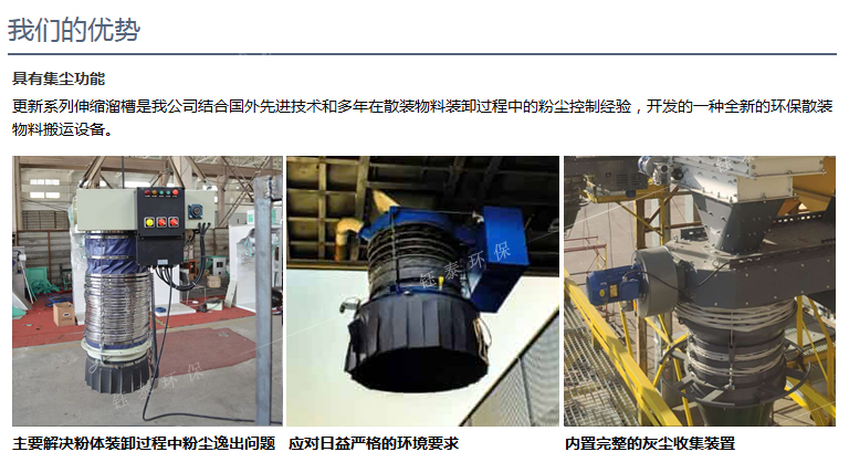 服務(wù)電話:13091153069(同微信)伸縮式卸料管是一種物料處理設(shè)備,用于將粉末和干散狀物料無塵地裝入或卸入容器、卡車和船只。它是一種自動化且靈活的解決方案,可以根據(jù)不同行業(yè)的需求進(jìn)行定制。伸縮式卸料管系統(tǒng)的主要功能是通過垂直的鐵管利用物料自身的重量排放粉末或顆粒狀散裝固體,同時通過外層的一層帆布材料的布筒收集卸料時產(chǎn)生的粉塵。為了適應(yīng)上部排放點和下部裝載點之間的不同高度,鐵管被設(shè)計為可伸縮的。鐵管的靈活性是伸縮式卸料管系統(tǒng)的關(guān)鍵特性,它允許根據(jù)不同的排放和裝載點進(jìn)行調(diào)整,使其成為廣泛應(yīng)用的多功能解決方案。