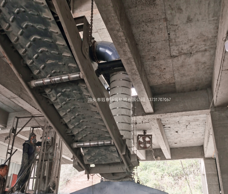 根據(jù)袋水泥裝車機(jī)生產(chǎn)工藝要求,需要膠帶機(jī)前后運(yùn)行,設(shè)計(jì)在移動(dòng)膠帶機(jī)車的尾部安裝一臺(tái)固定收塵集箱,集箱一側(cè)出口連接500mmX500mm可伸縮移動(dòng)管道,一般可移動(dòng)伸縮8m長(zhǎng)度,把可移動(dòng)吸塵罩收集的粉塵氣體通過(guò)此移動(dòng)管路輸送到固定管路,再由固定管路將粉塵氣體輸送到除塵器內(nèi)進(jìn)行凈化處理,移動(dòng)管路內(nèi)部安裝多個(gè)滾輪軸承,每節(jié)移動(dòng)管路上都設(shè)有法蘭油浸羊毛氈做為密封,可滿足袋水泥裝車機(jī)前后移動(dòng)運(yùn)行的要求。